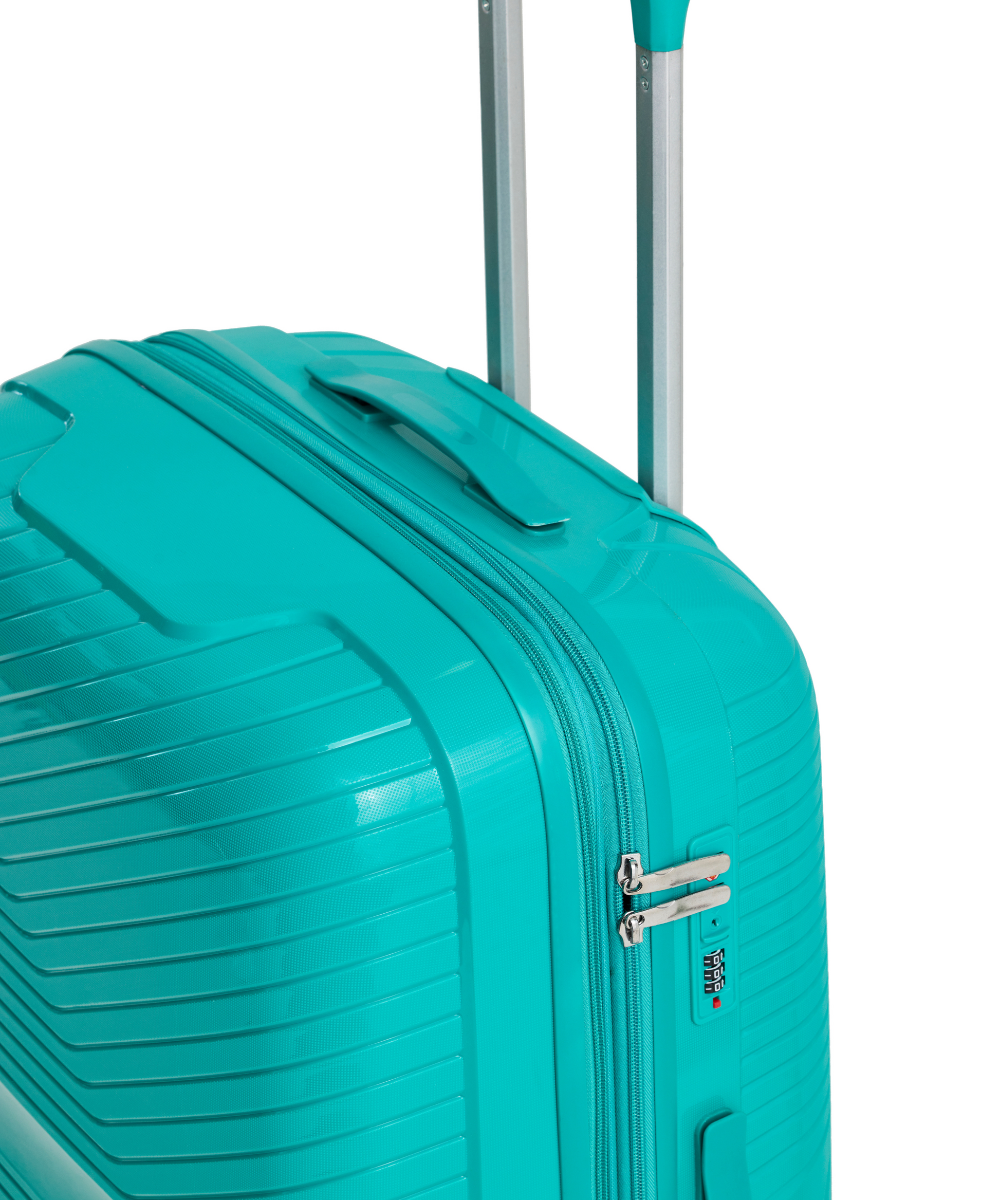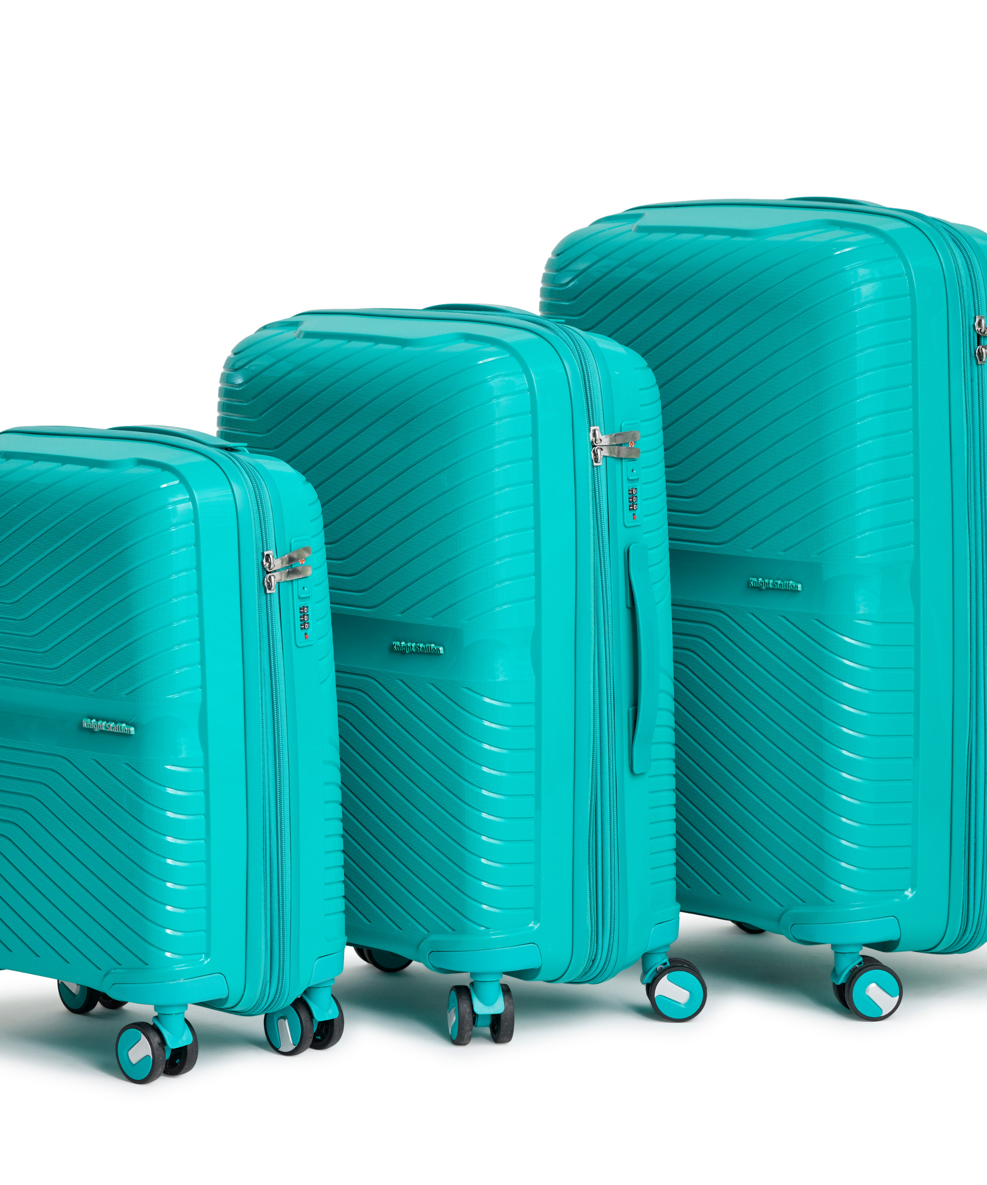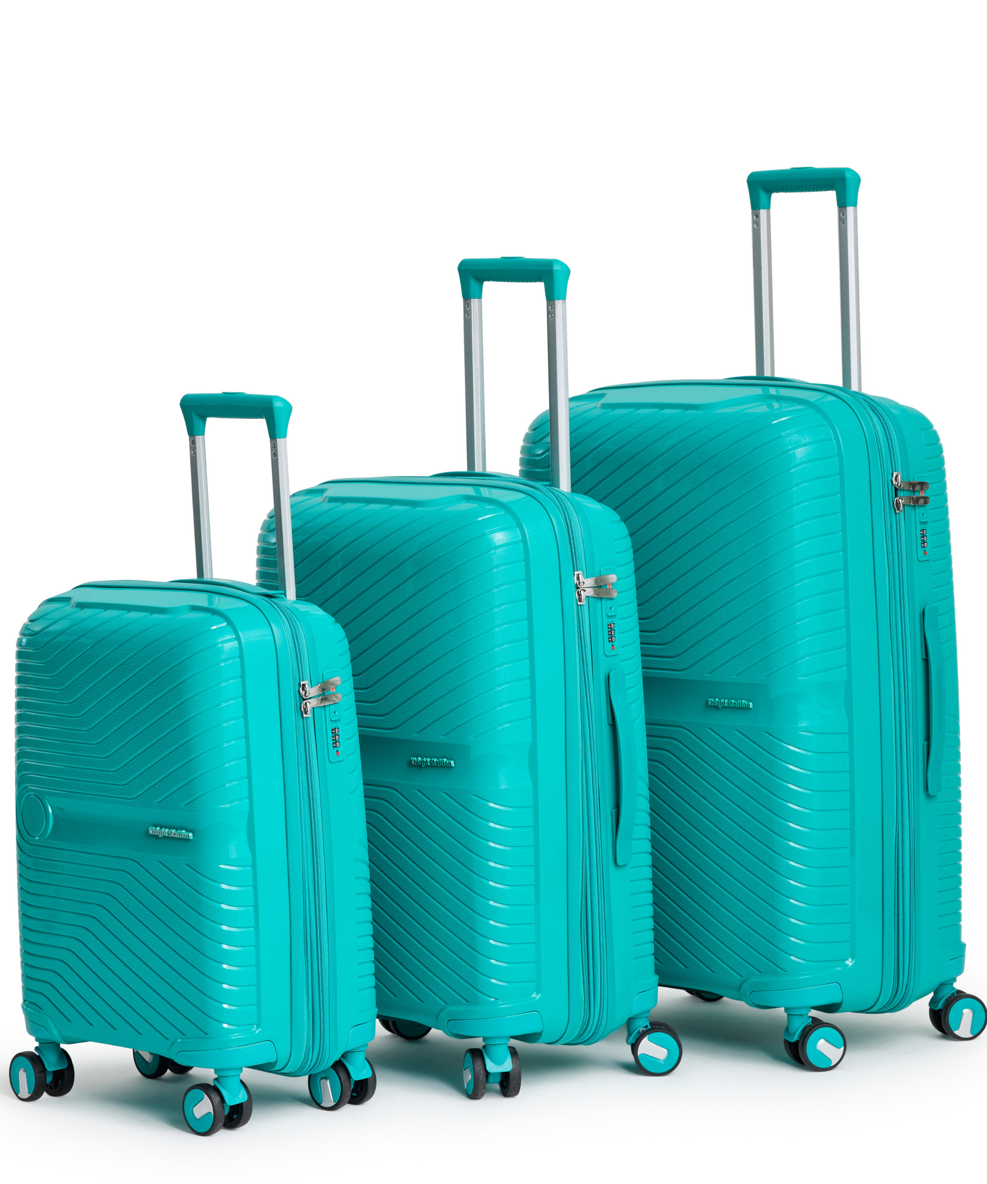 A luggage set of 3. Add a touch of serenity to your travels with the Aqua Glide luggage set. Featuring a stunning teal shade inspired by the calming depths of the ocean, this collection combines style, durability, and ease, making every journey effortlessly chic.